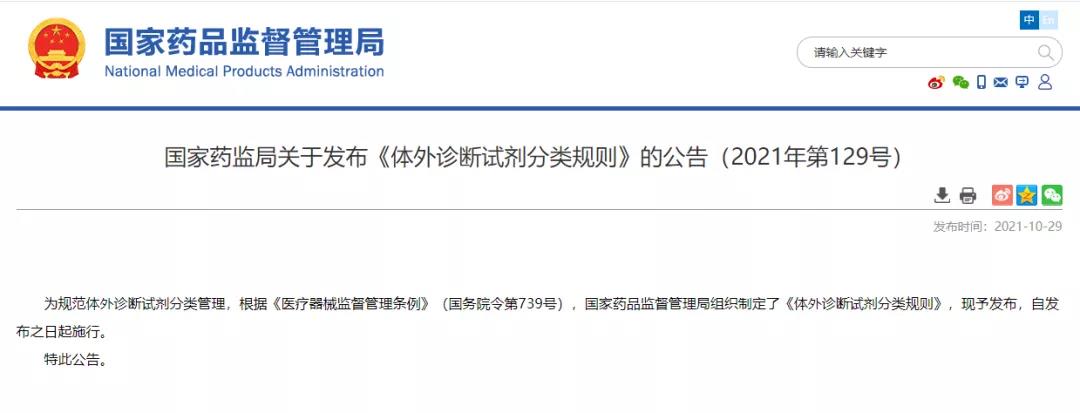 10月29日,国家药品监督管理局发布《体外诊断试剂分类规则》的公告(2021年第129号),进一步规范体外诊断试剂分类管理。