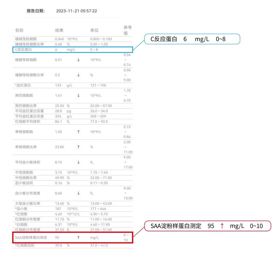 在常见的血液检测指标中,除常规的血常规、C反应蛋白(CRP)检测外,另一炎症指标——血清淀粉样蛋白A(SAA)的检测在该类疾病的诊疗中敏感性备受关注。
