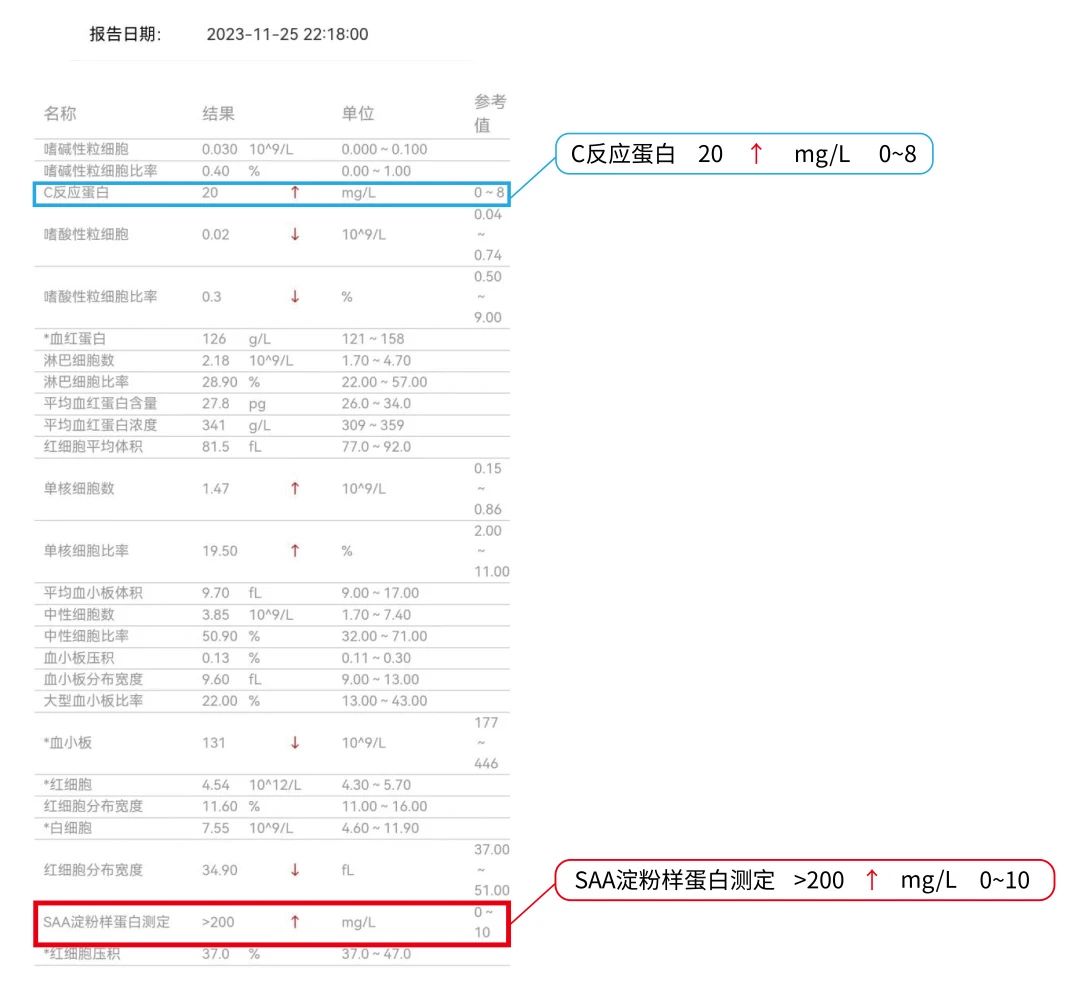 检测结果分析:CRP在感染早期未升高,SAA早期升高到参考值上限9倍;随着病情严重,CRP与SAA均升高,SAA为参考值上限20倍。