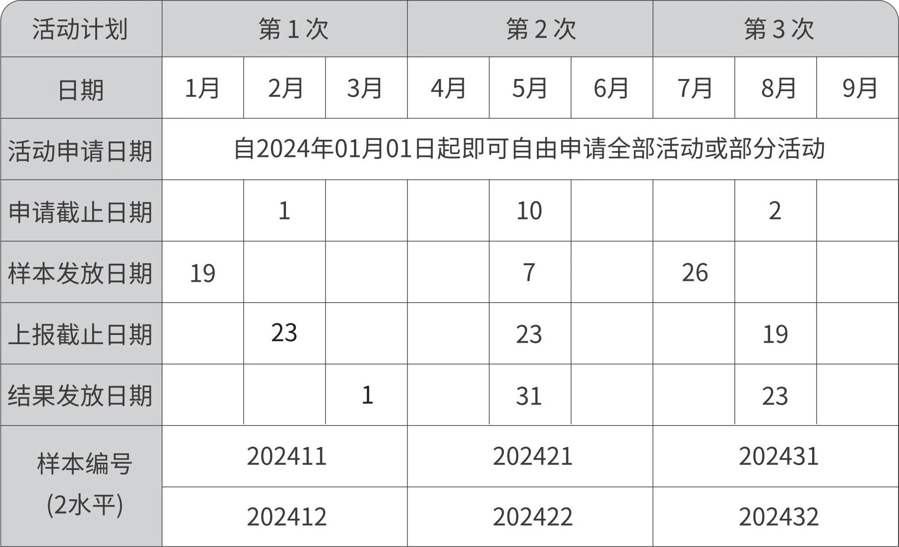 2024年米兰(中国)质量评价计划全年开展3次,每项活动每次发放2个浓度水平样本各1支。开展的活动及项目具体如下: