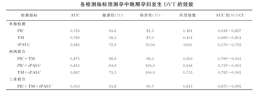 为了降低产前和产后出血的风险,并在妊娠和分娩期间维持胎盘功能,生理高凝状态伴随着整个妊娠时间,然而过度的高凝状态极易并发妊娠期VTE。沈劼等研究表明Caprini评分与静脉血浆TM、TAT、t-PAIC、PIC水平对剖宫产术后DVT形成风险有较好的预测价值,提示临床可根据新血栓四项水平早期采取措施预防术后DVT的发生。王宇等研究表明TM、TAT、t-PAIC、PIC为影响孕中晚DVT发生的独立预测因子,新血栓四项联合检测对孕中晚期孕妇发生DVT的预测价值明显优于各单项指标检测或两两联合(P<0.05),提示联合检测可为临床早期诊治提供参考,见下表。