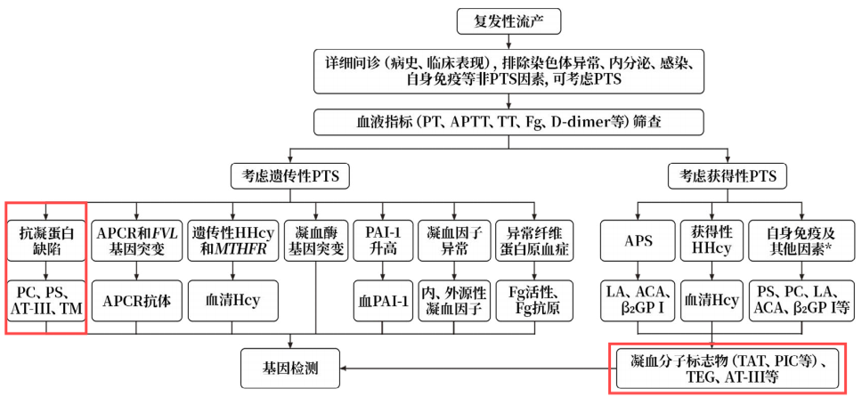 新血栓标志物对PTS有重要提示意义,《复发性流产合并血栓前状态诊治中国专家共识(2021)》中指出对于RSA合并PTS患者进行凝血功能的筛查,除PT、APTT等常用指标外,有条件者可开展TAT、TM、PIC等分子标志物,以评价患者体内凝血功能及血管内皮状况,如图1所示。《复发性流产病因检查专家共识(2022)》中建议有条件者可开展新血栓4项(TM、TAT、t-PAIC、PIC)检测。