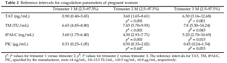 目前绝大多数实验室给出的凝血指标参考范围都是非孕期和普通人群,而妊娠期孕妇的血液是处于生理性的高凝状态,故孕妇不能参照非妊娠人群凝血指标的参考区间,在将血栓四项指标普遍用于妊娠期间与血栓性疾病的临床评估之前,有必要为健康孕产妇建立参考区间。北京大学第三医院张文静等老师在《THE JOURNAL OF Obstetrics ancGynaecology Research》发表的学术论文对中国孕妇妊娠期TAT、TM、t-PAIC、PIC的变化及健康孕产妇妊娠期特定参考范围进行了研究。研究纳入华北地区190例健康孕产妇,采用化学发光法检测TAT、TM、t-PAIC和PIC水平,在2.5%和97.5%的分布范围建立了妊娠期特定参考区间(结果见表2)。最终研究表明,TAT、TM、t-PAIC的水平从孕早期(妊娠5-12周)到孕晚期(妊娠28-40周)显着增加,而PIC的水平并没有随着孕周的增加而发生显著变化。