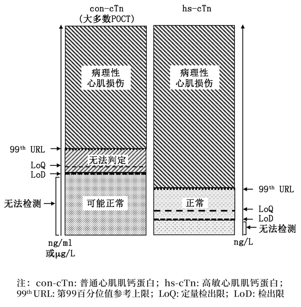 需要注意的是,不同hs‑cTn试剂方法学具有不同的LoD和定量检测限(limit of quantification,LoQ),应采用绝对浓度变化值作为阈值。不同性别的心脏质量、激素和代谢等具有差异,hs‑cTn由于灵敏度高,故其99th URL在男性和女性中也存在显著差异,在临床实践中采用性别特异性参考值对于提高诊断准确性和改善预后评估具有重要意义。