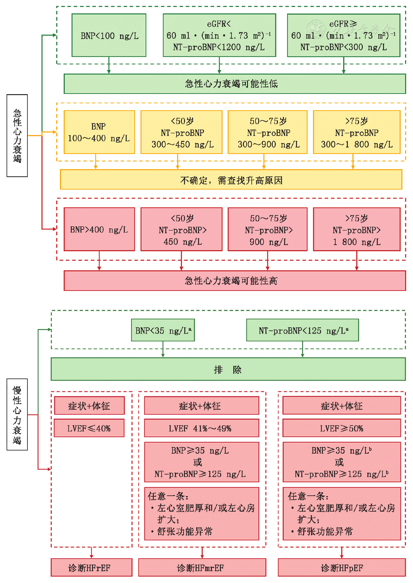 BNP和NT‑proBNP均为心力衰竭诊断和鉴别诊断的**标志物,但二者检测方法多样,不同检测方法结果间不能直接比较。因二者的分子结构、清除途径和半衰期的差异,临床应用中需注意年龄、肥胖、肾功能和药物对其影响。对于肾功能不全[eGFR<60ml·(min·1.73m2)-1]和肥胖者(BMI>30kg/m2)BNP/NT‑proBNP用于排除和诊断心力衰竭时需采用校正的截断值。